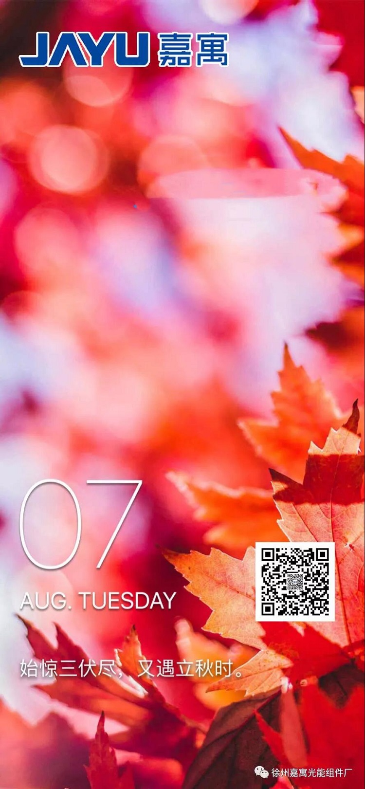 立秋,讓成熟的萬物更加芬芳,讓豐華的人生更加華美。嘉寓光能期待大家在立秋之后的人生節氣里,能有一份秋的從容,秋的沉靜。
