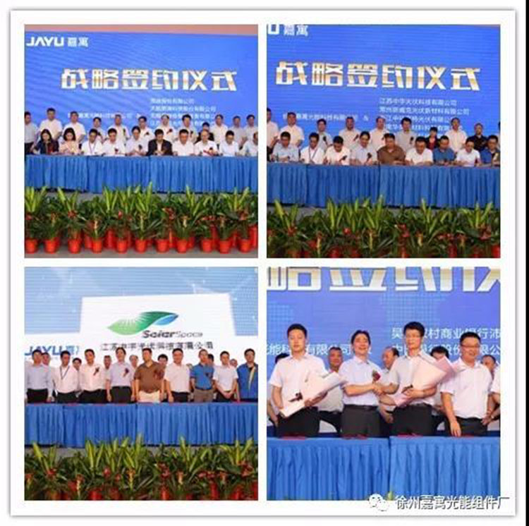 與茂迪股份有限公司、太極能源科技股份有限公司、無錫奧特維智能裝備有限公司、TUV北德集團、江蘇順風光電科技有限公司、華美新材料科技有限公司、江蘇中宇光伏科技有限公司、常州斯維克光伏新材料有限公司、浙江中環賽特光伏有限公司 、江蘇鼎飛鋁業科技有限公司、江蘇銀行股份有限公司沛縣支行、吳江農村商業銀行沛縣支行、中國銀行股份股份有限公司沛縣支行十三家企業簽署了戰略合作協議。