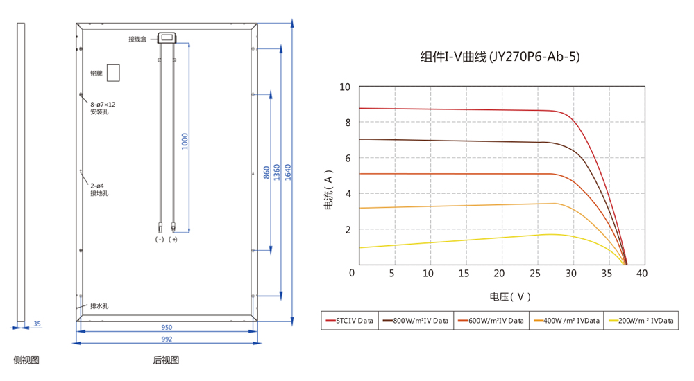 | 標準測試條件:大氣質量AM1.5,輻照度1000W/ ㎡,電池溫度25℃. | |||